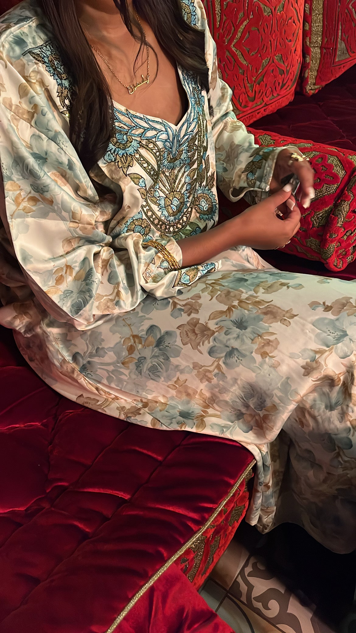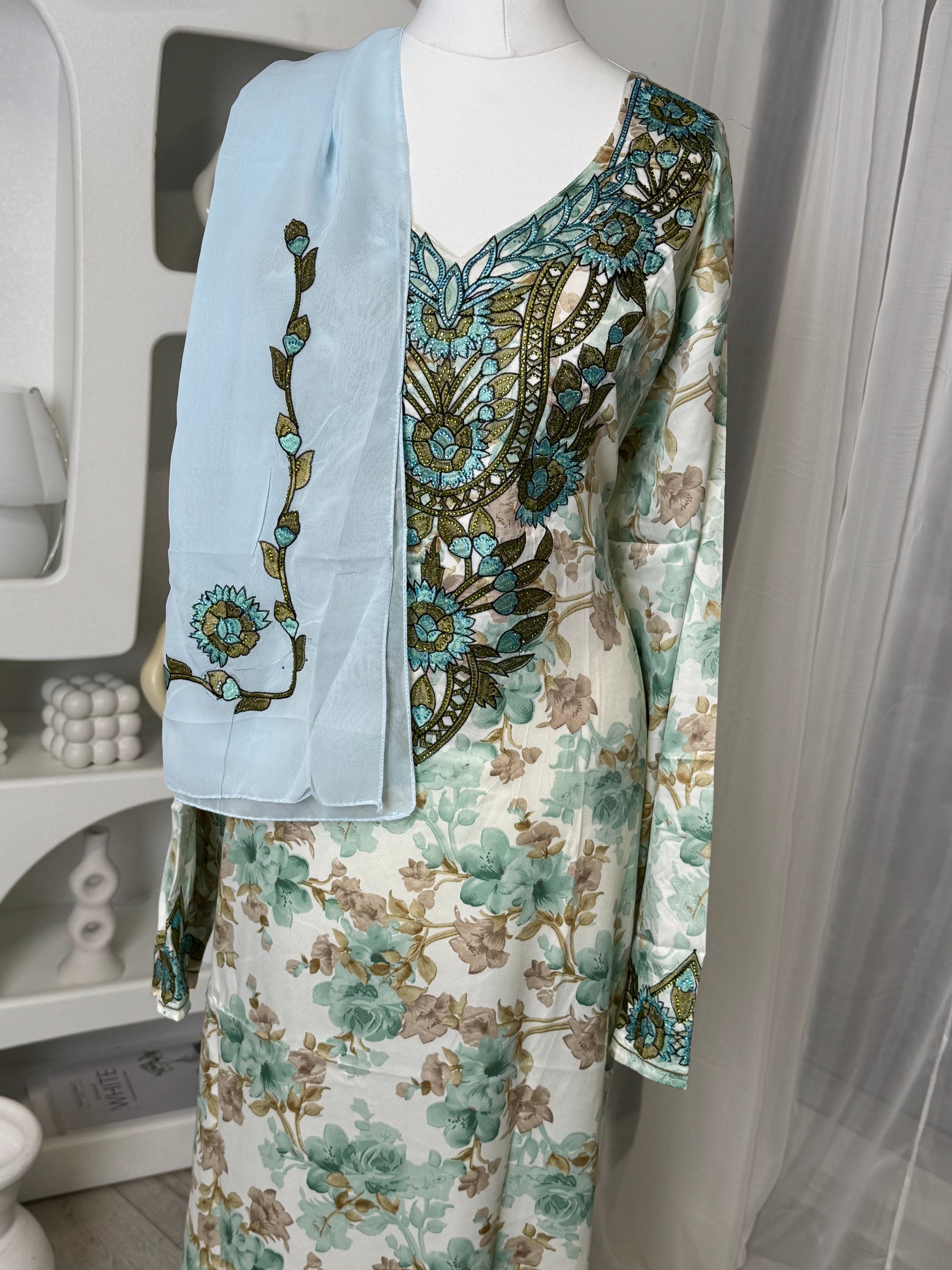Experience effortless elegance with the Pastel Drift Mukhawar in soft baby blue. Its delicate embroidery highlights the dreamy pastel shade, making it an ideal choice for daytime events, special evenings, or Ramadan nights. Crafted from flowy, breathable fabric, it ensures comfort while maintaining a graceful silhouette. Complete with a matching headscarf, this set offers a polished, ready-to-wear look that brings both style and ease to your wardrobe.