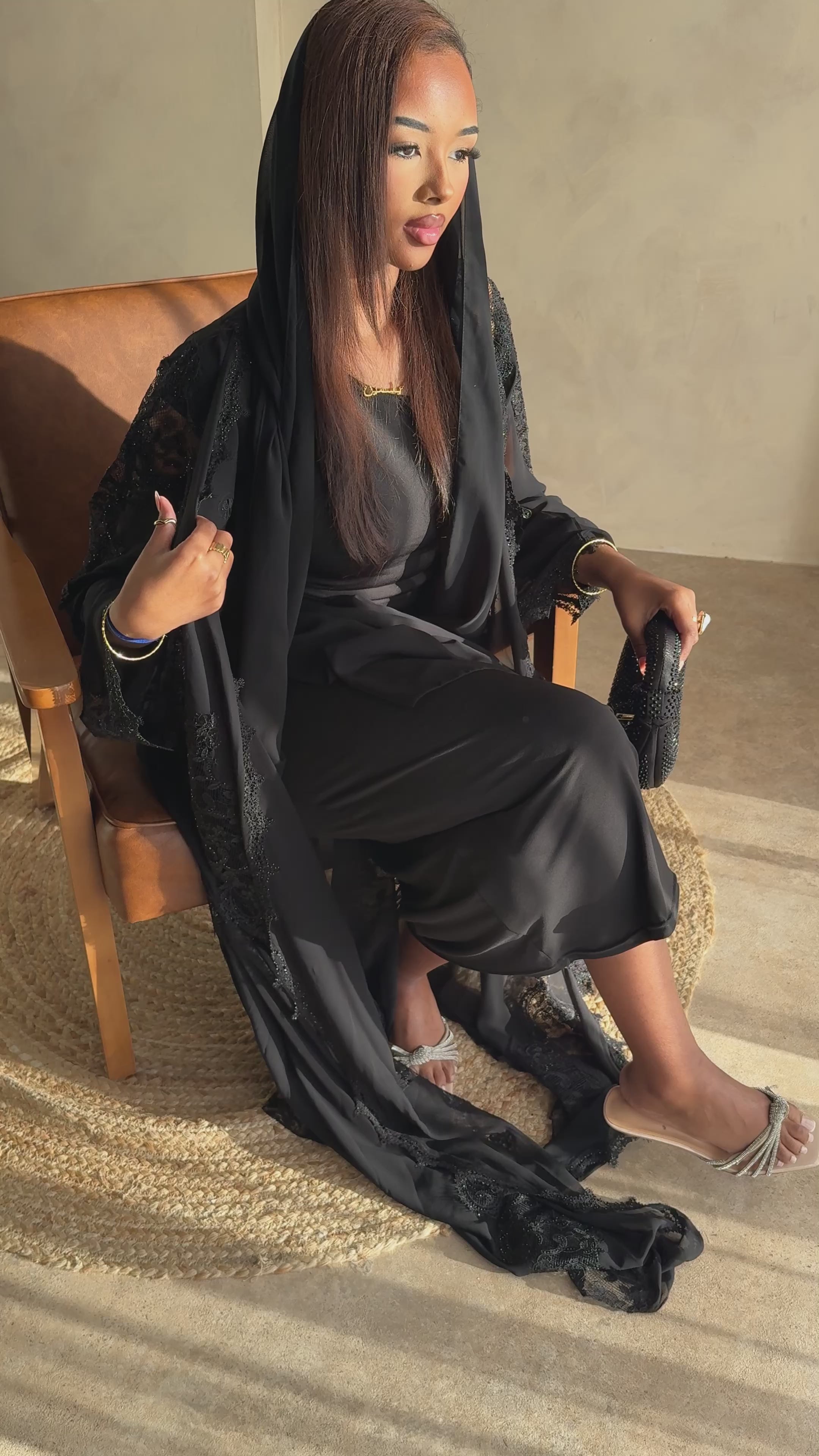Noor is a black abaya defined by delicate lace detailing and fluid sheer layers that move beautifully with the body. Designed to feel light yet refined, this piece captures a sense of quiet luminosity.